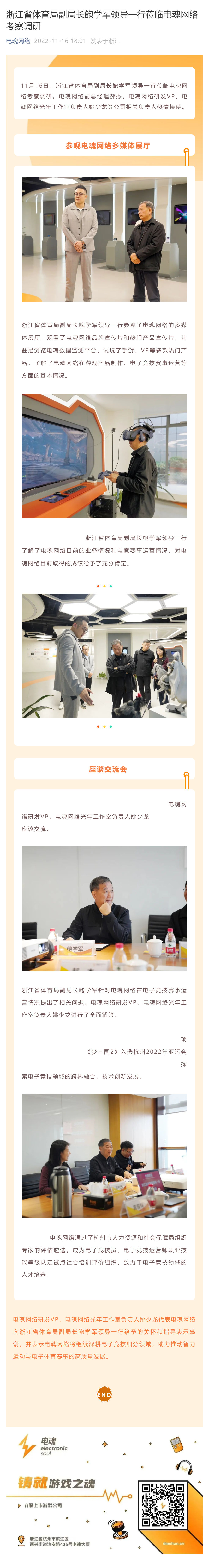 浙江省體育局副局長鮑學軍領導一行蒞臨電魂網絡考察調研